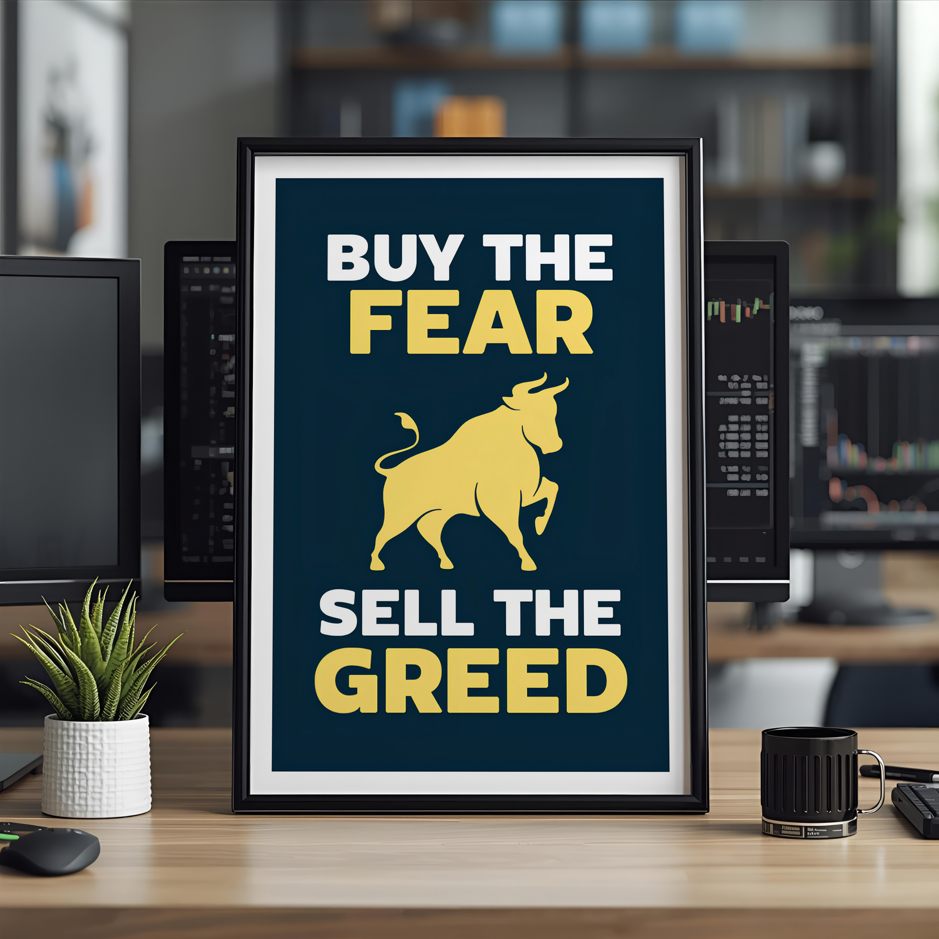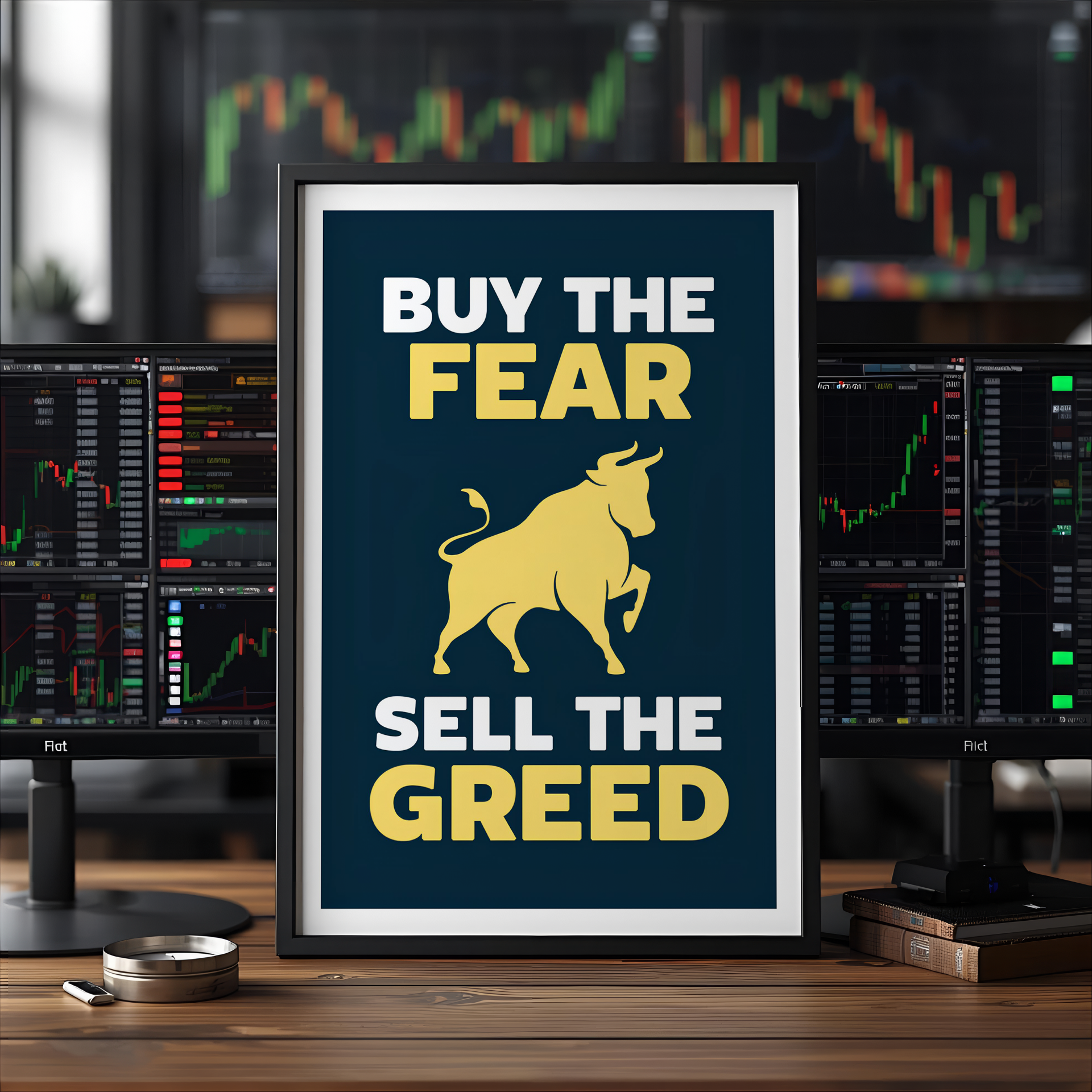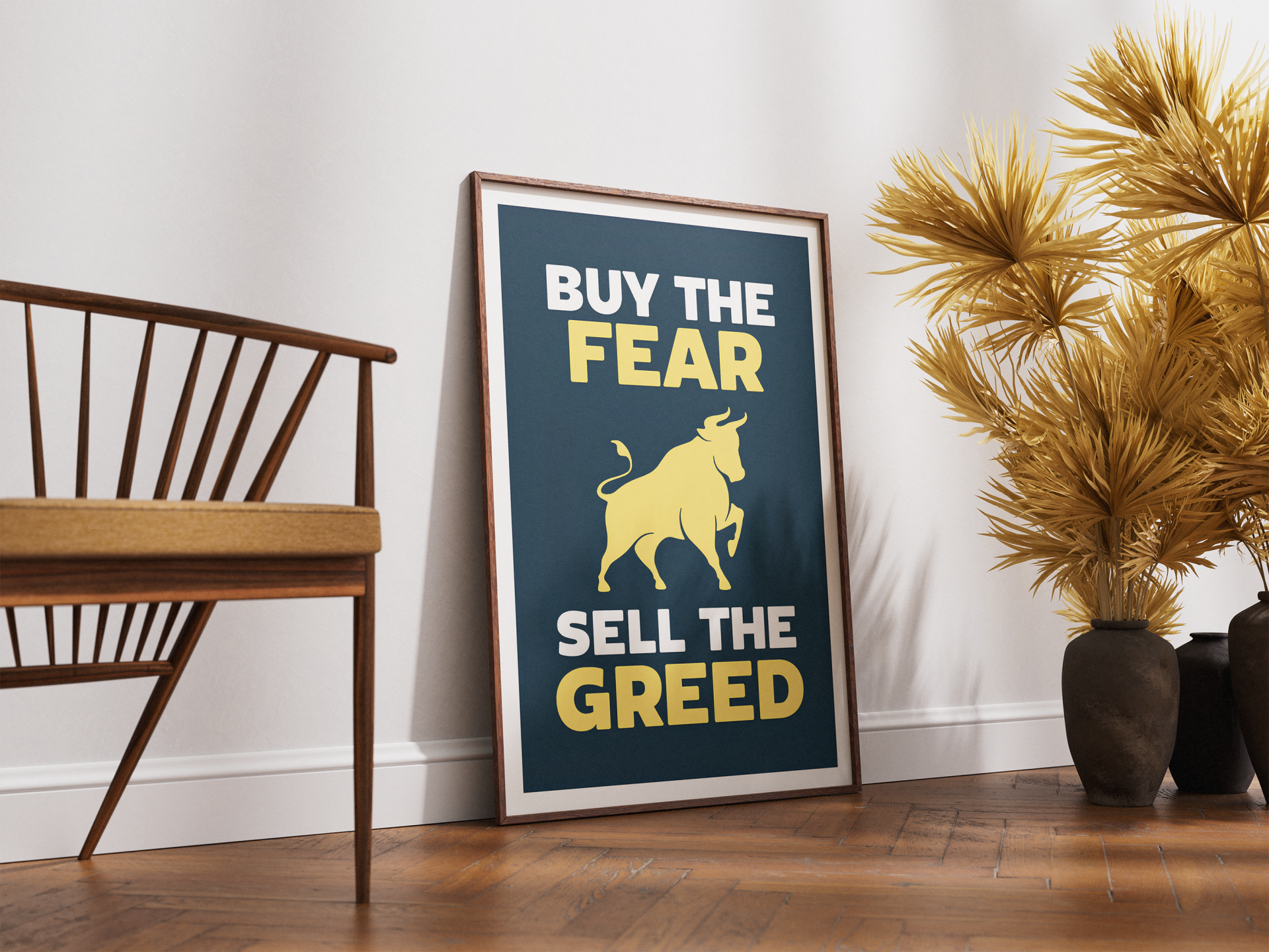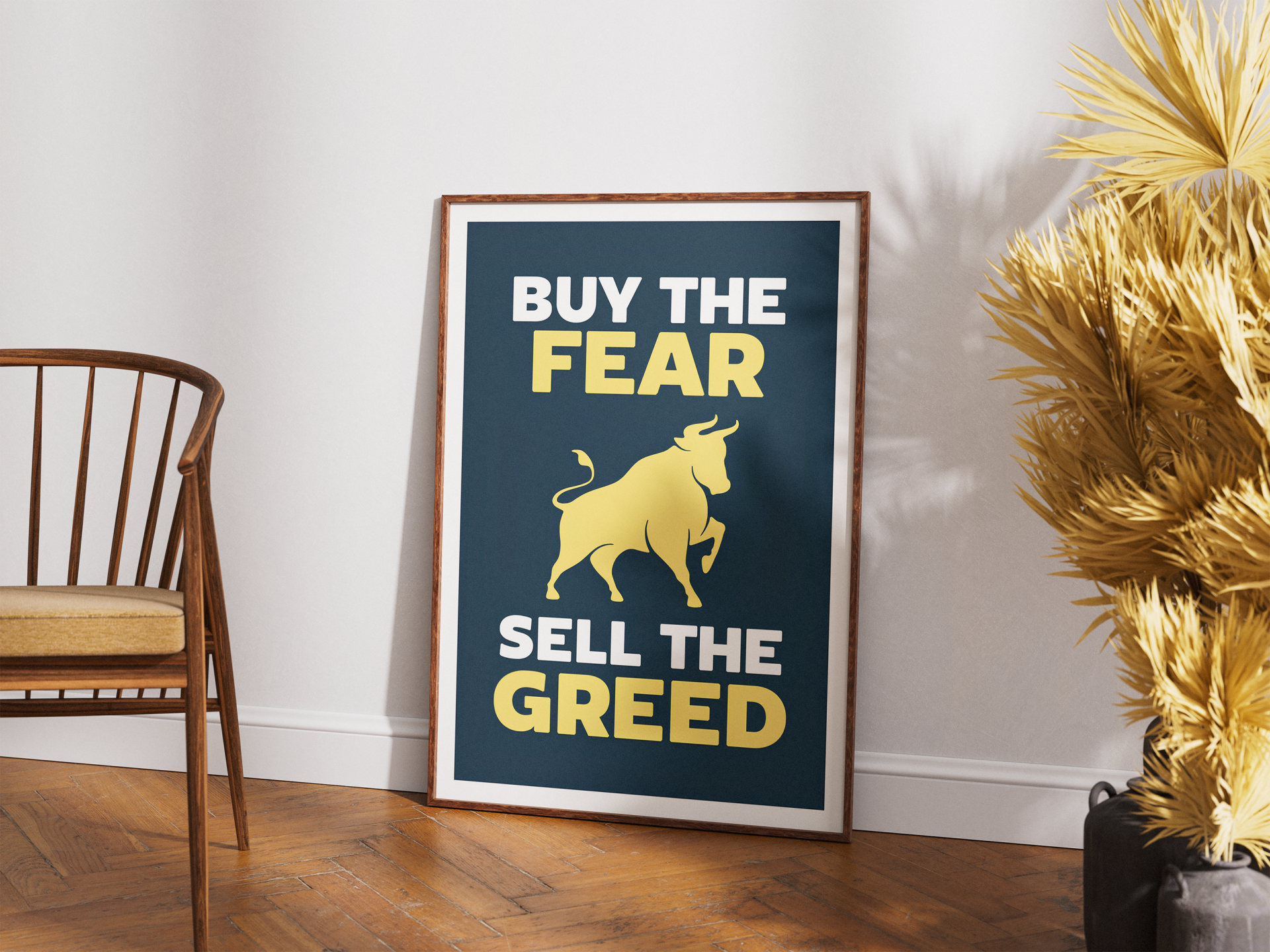 Bu çarpıcı poster, 50x70 cm ölçülerinde çerçevesiz olarak rulo içinde sunulmaktadır. Güçlü bir boğa figürü ile tasarlanan grafik, "Buy the Fear, Sell The Greed" mesajıyla yatırım dünyasının temel prensiplerini yansıtır. Modern ve minimalist tarzıyla her ortama uyum sağlar, dekoratif bir dokunuş ekler. Kolayca sergilemek için idealdir!