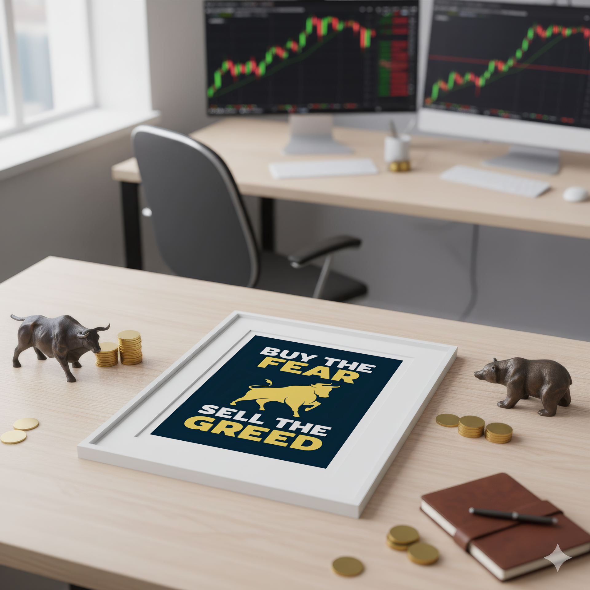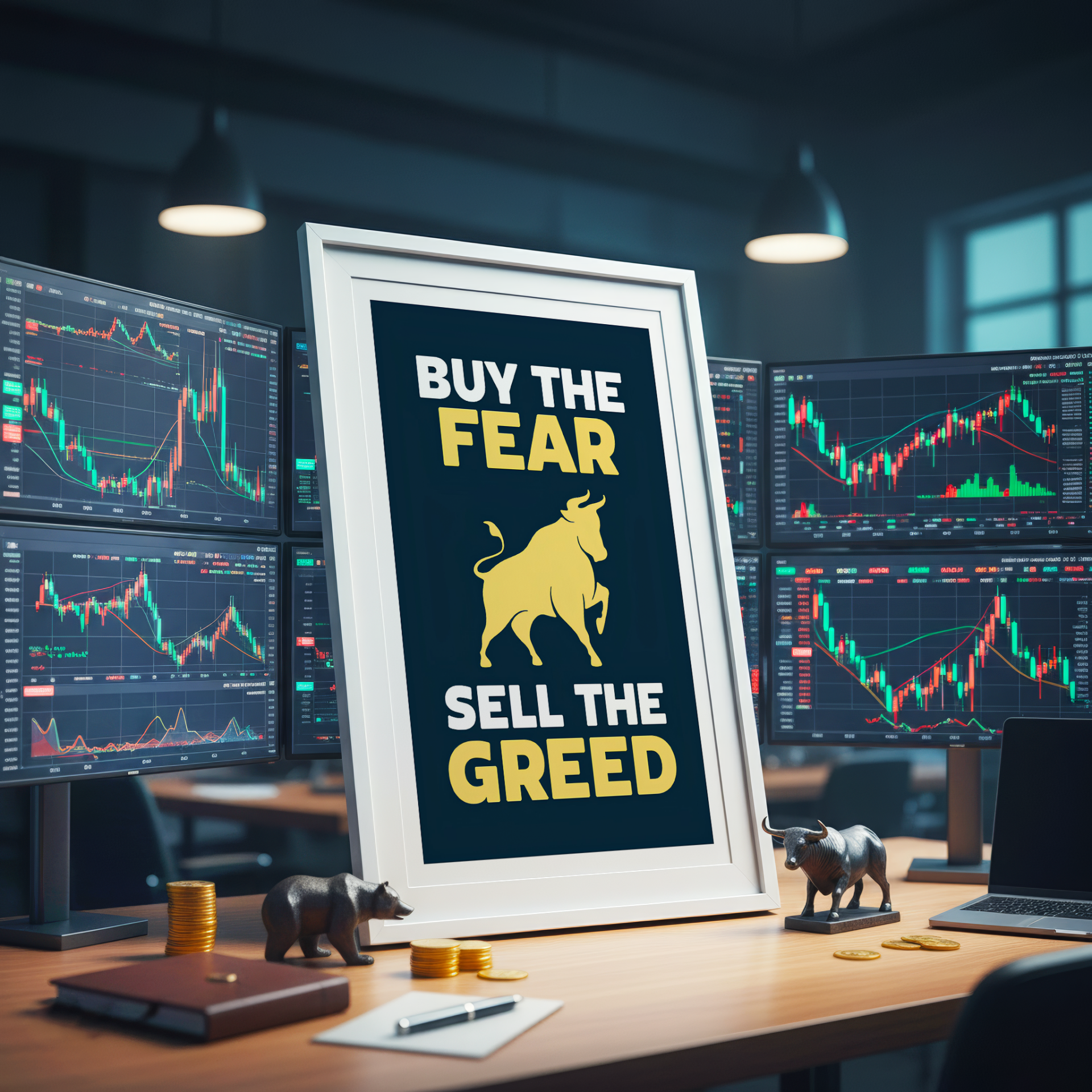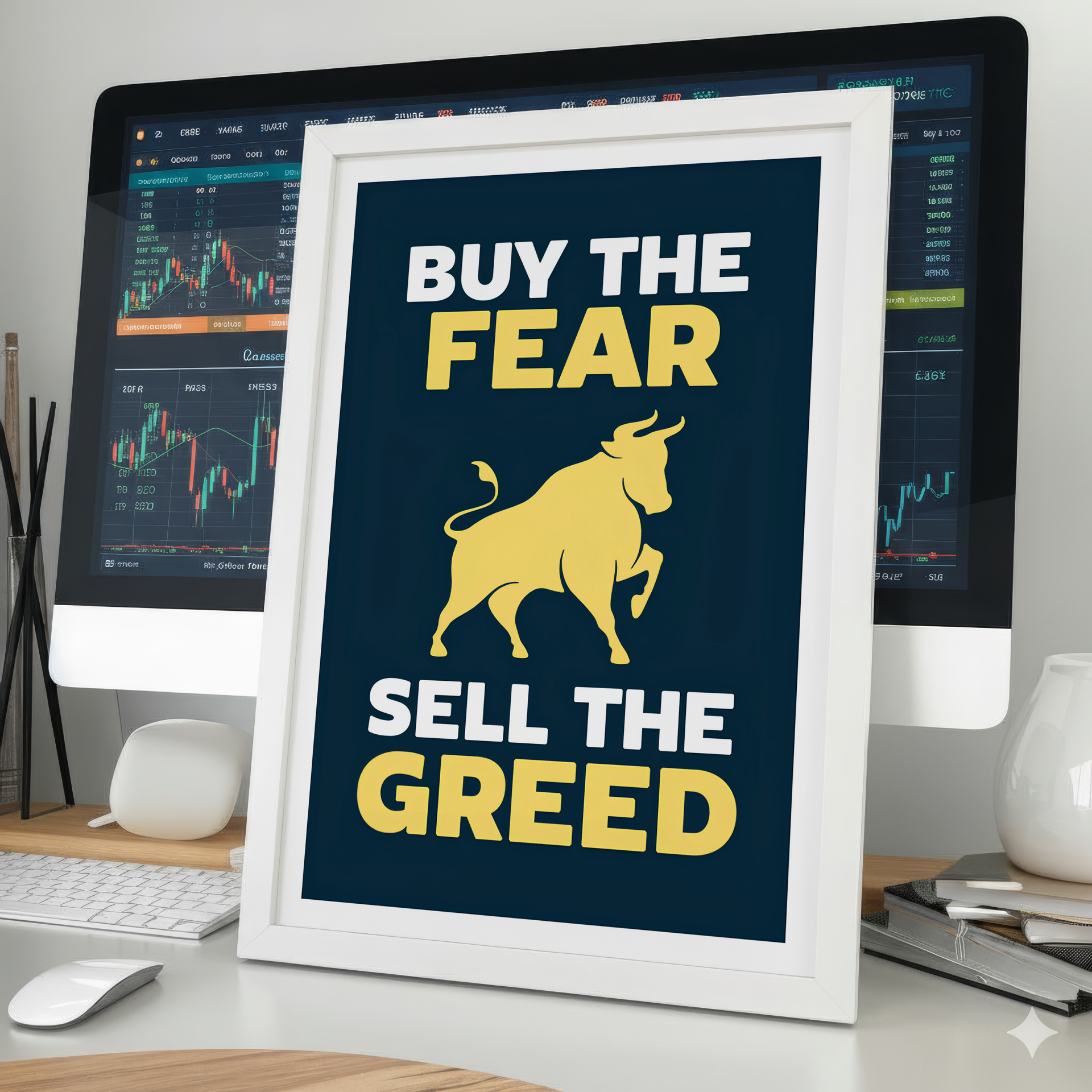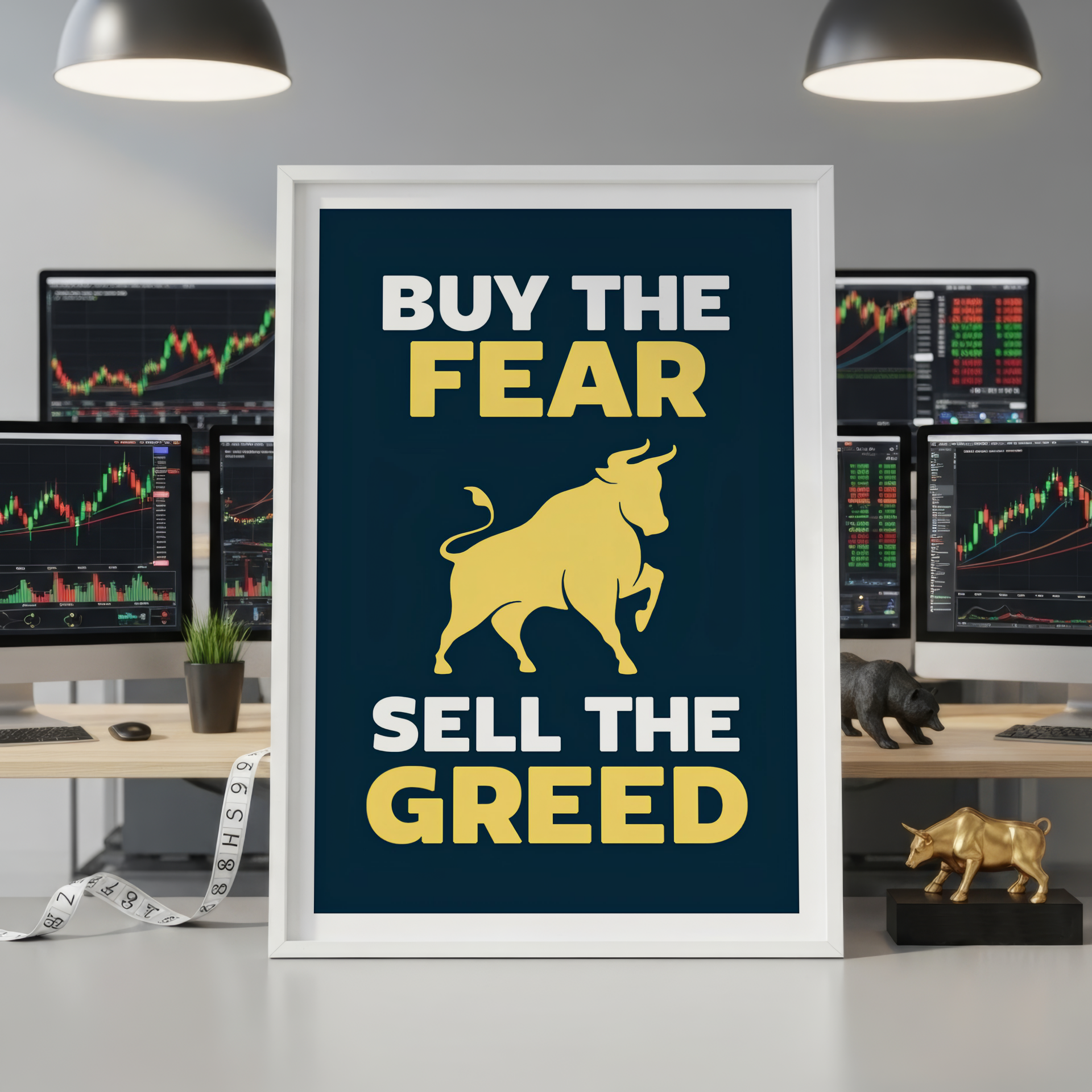 Bu çarpıcı poster, 50x70 cm ölçülerinde çerçevesiz olarak rulo içinde sunulmaktadır. Güçlü bir boğa figürü ile tasarlanan grafik, "Buy the Fear, Sell The Greed" mesajıyla yatırım dünyasının temel prensiplerini yansıtır. Modern ve minimalist tarzıyla her ortama uyum sağlar, dekoratif bir dokunuş ekler. Kolayca sergilemek için idealdir!